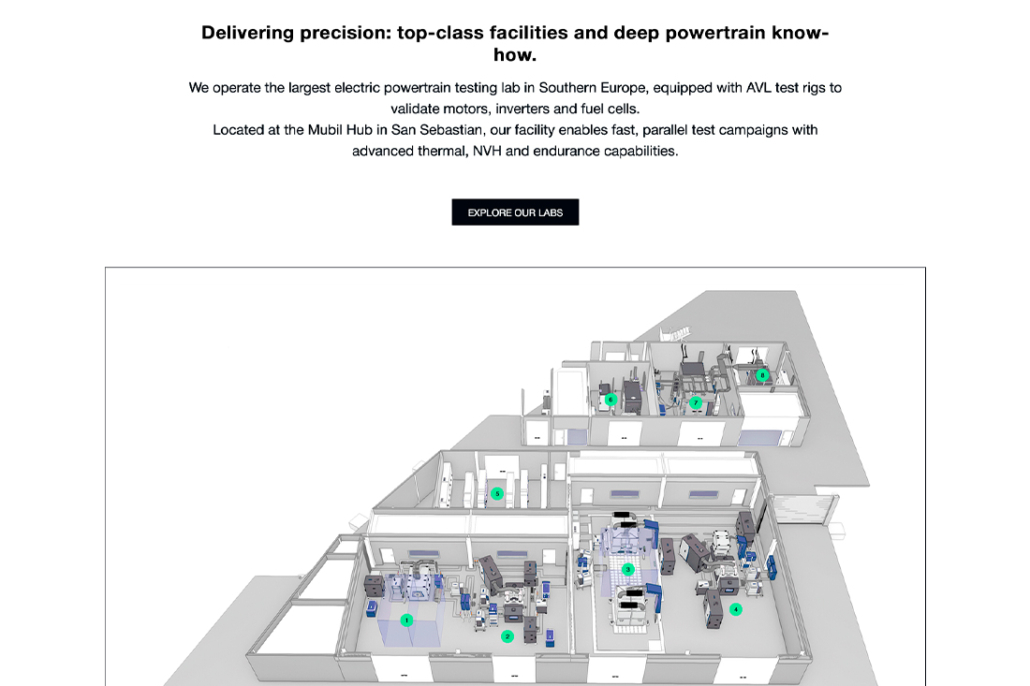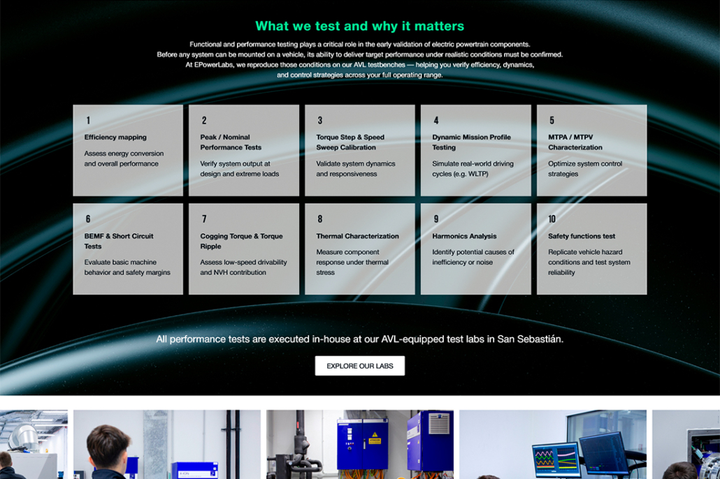 Motore, inbersore, ardatz elektriko eta erregai-pilen testeo zerbitzutan eta honetarako dituzten laborategi eta ekipamenduetan egin dugu indarra. Irudi bidezko eta idatzizko eduki erakargarri eta ulergarriarekin elikatzeaz gain, informazio teknikoa ere eskaini dugu webgunean, bezeroei ahalik eta informazio egokiena eskain diezaieten.