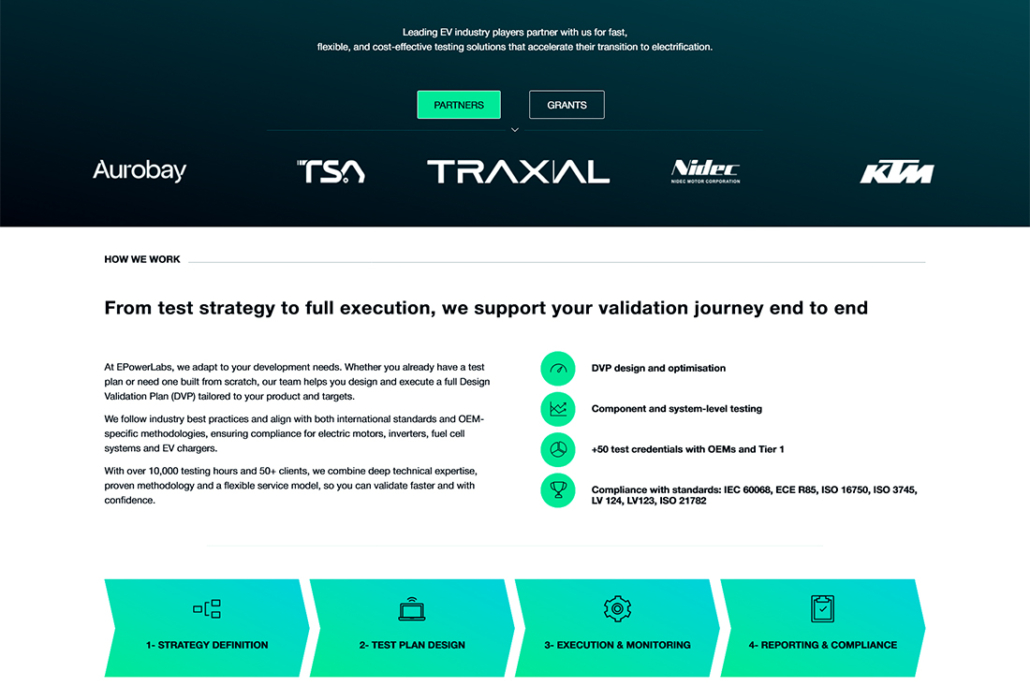 EPowerLabs propultsio elektrikoko sistemen balidaziorako enpresaren webgunea diseinatu eta garatu dugu, euren proiektu eta lanen nazioarteko erakusleiho digitala izan dadin.